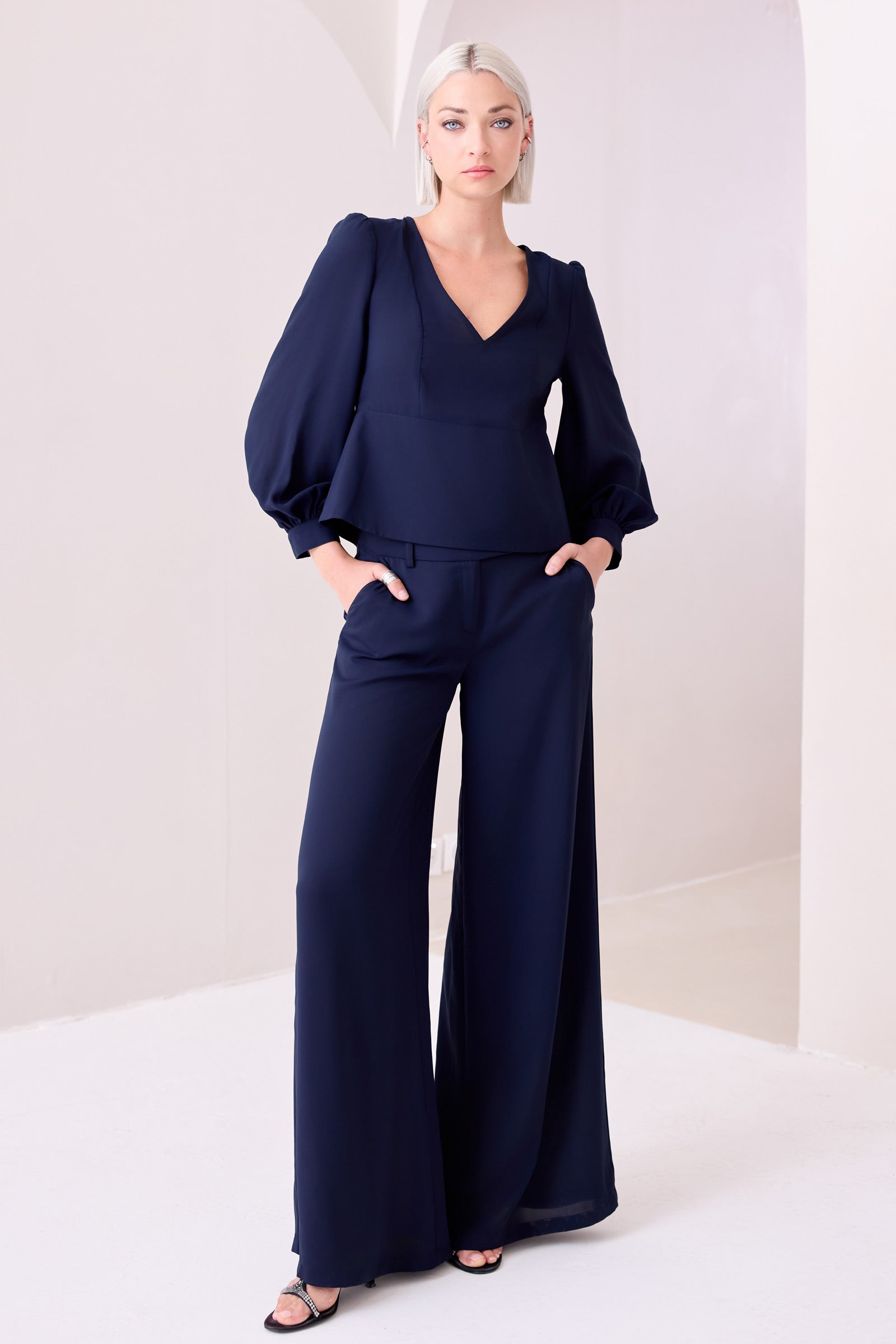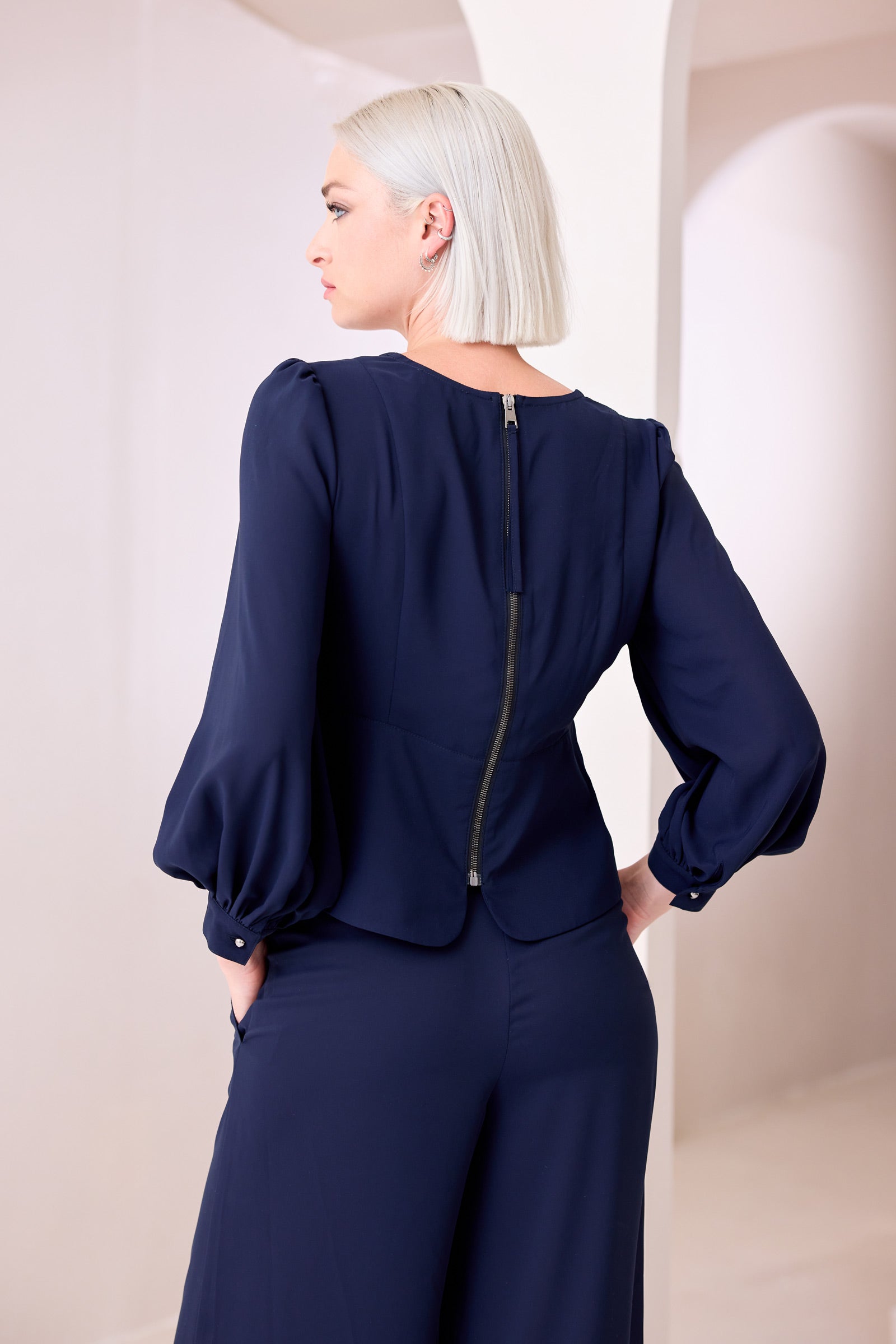 Blouse manches bouffantes, réalisée dans une matière fluide, encolure en V et dos fermé par un zip métal, ultra original