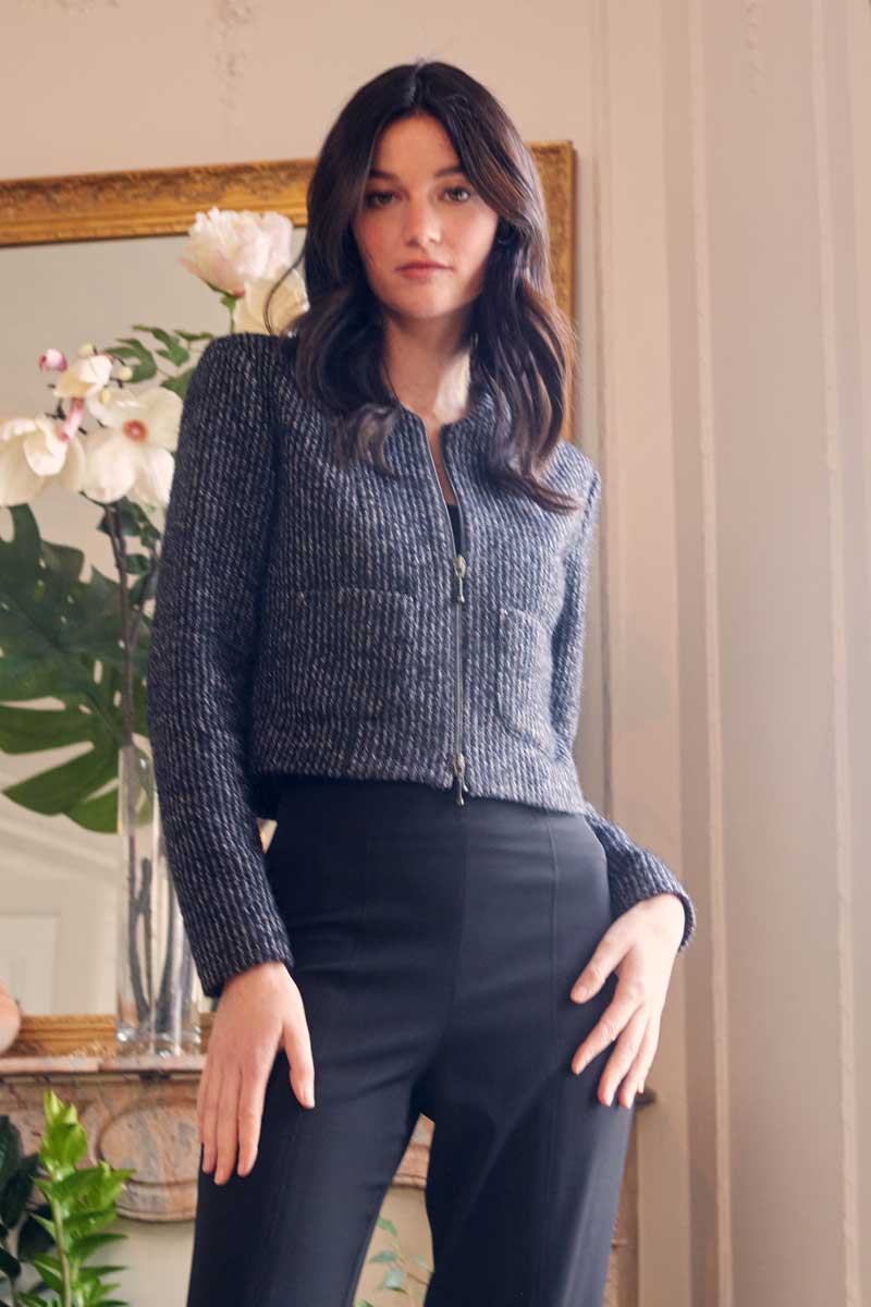 •Blouson très original, agrémenté d'un très beau zip métal italien, coupé dans une maille façon tweed aux couleurs bleu noir, chic et ultra confort