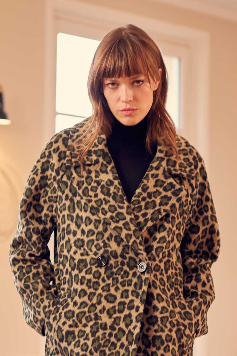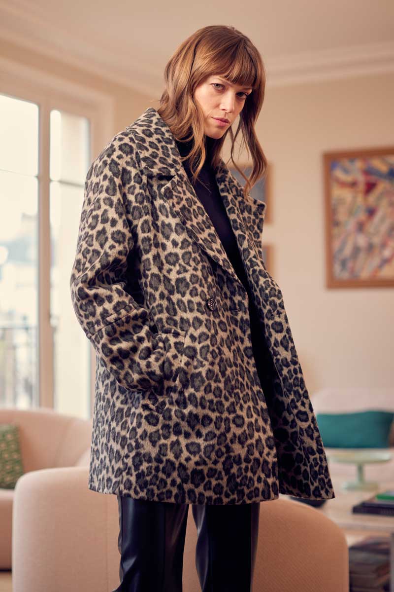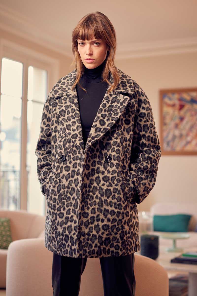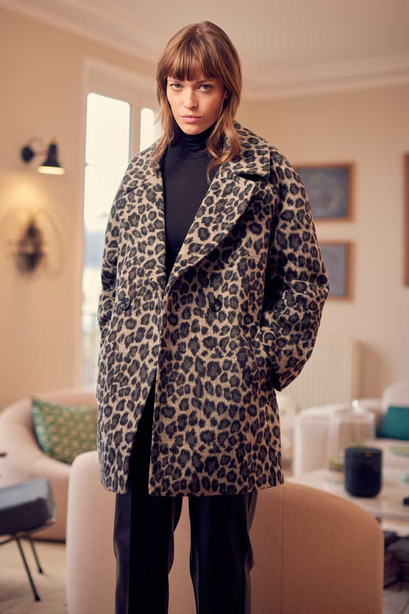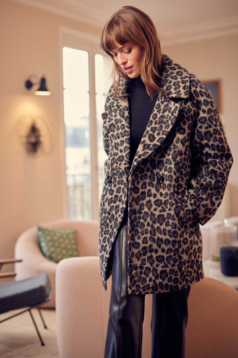 •Caban court imprimé panthère kaki ou gris, épaules raglantes, fermé par de très beaux boutons noirs, look assuré