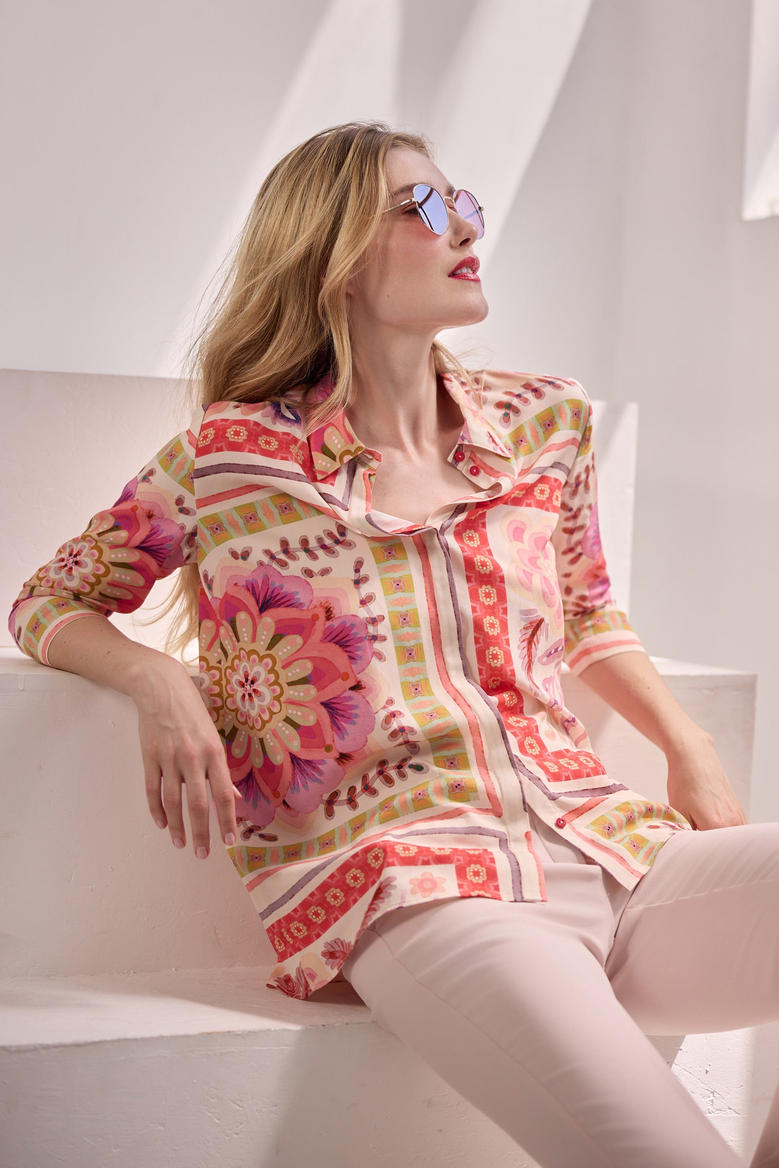Très belle chemise manches longues, patte de boutonnage cachée, imprimé foulard