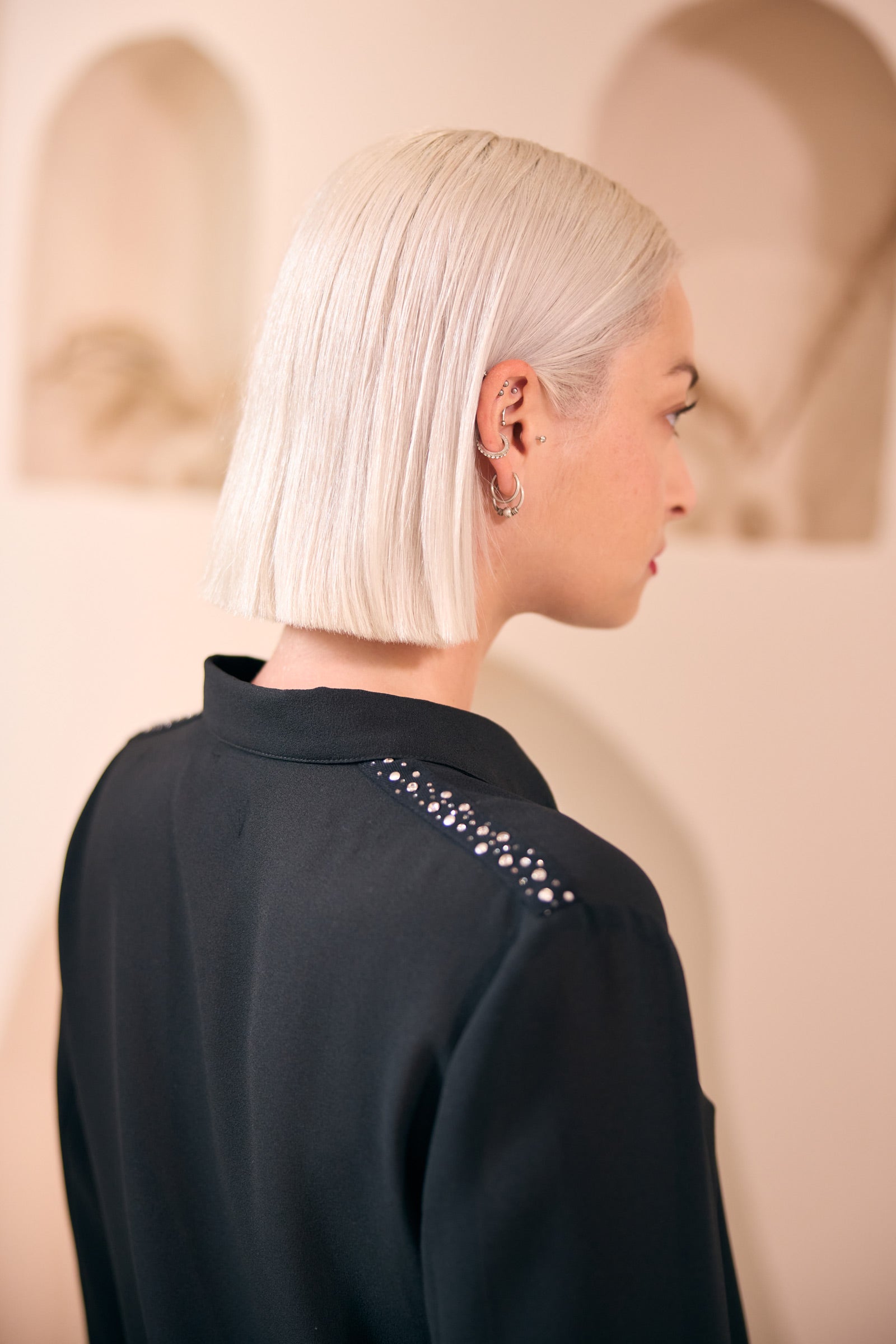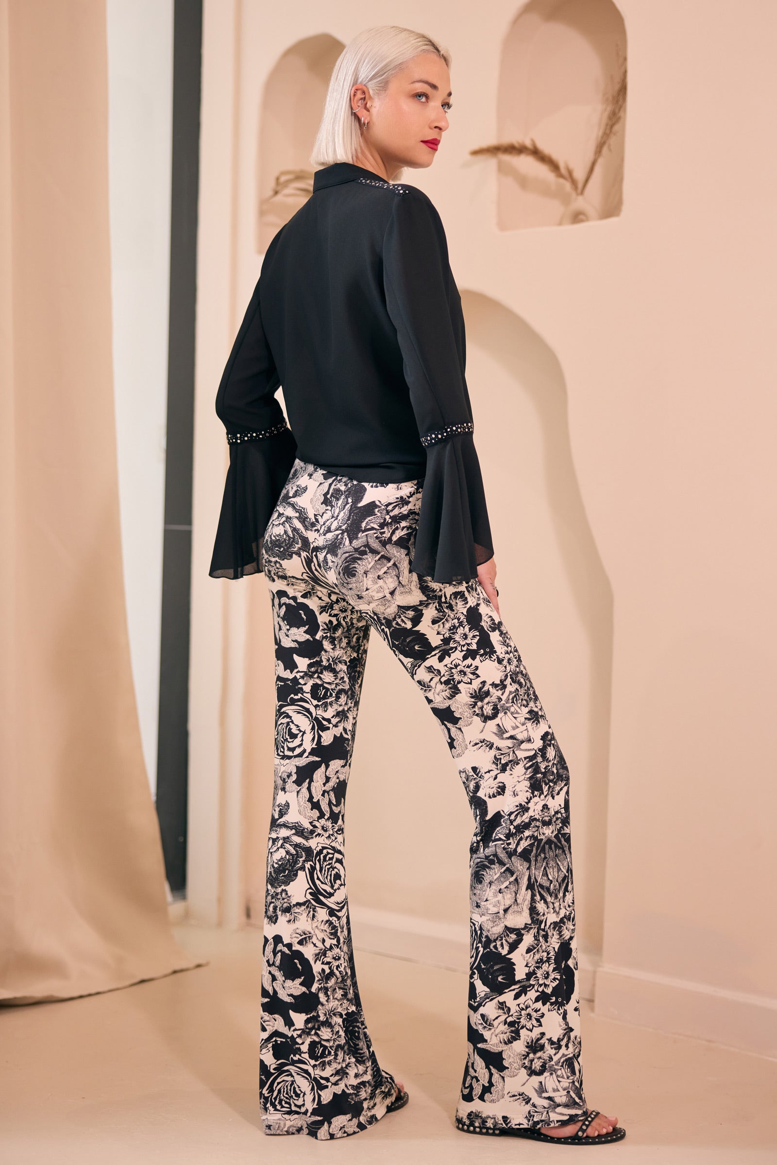 Chemise en crêpe fluide avec incrustations de rubans cloutés et strassés aux épaules et sur des manches très originales