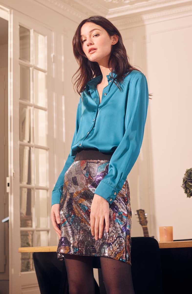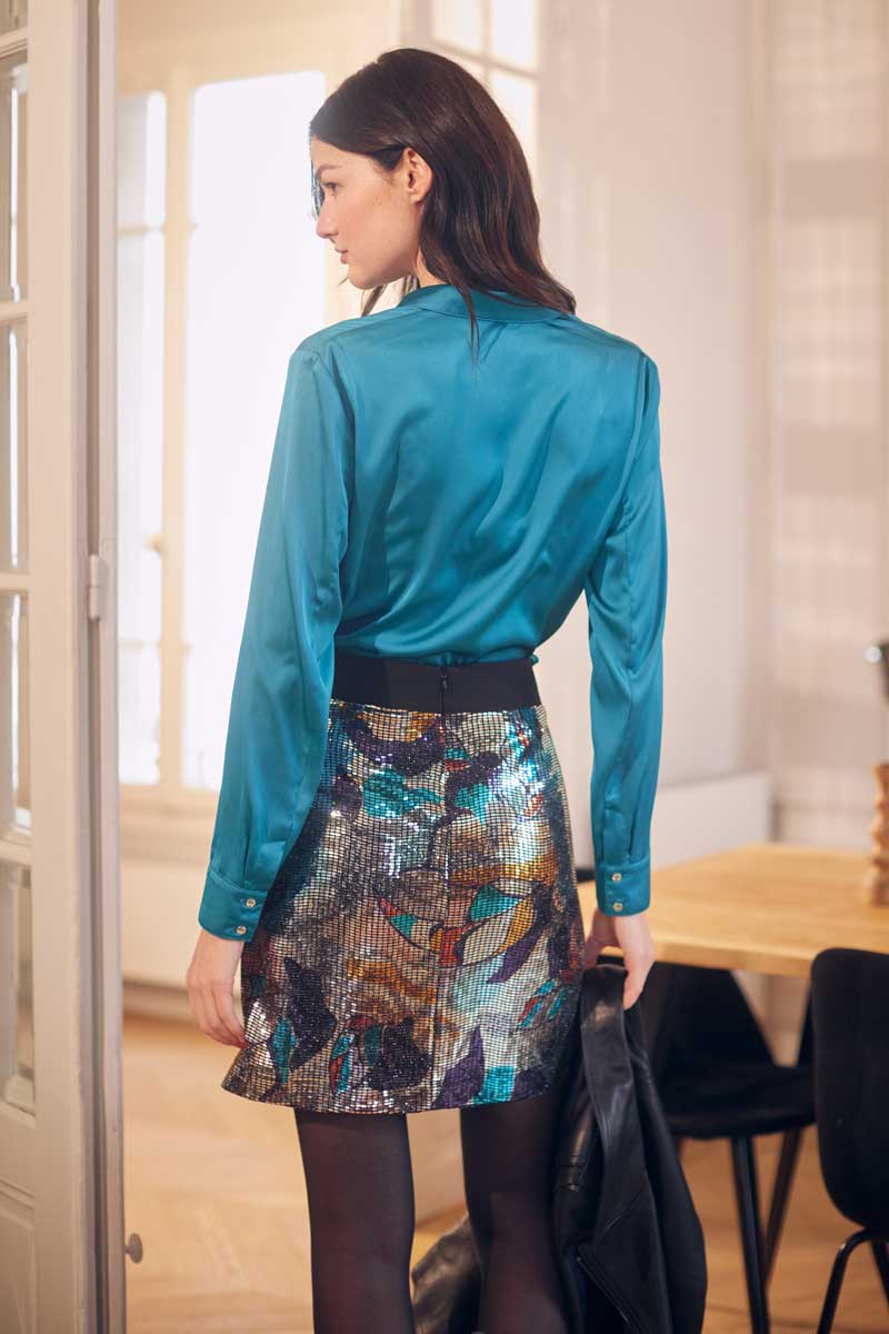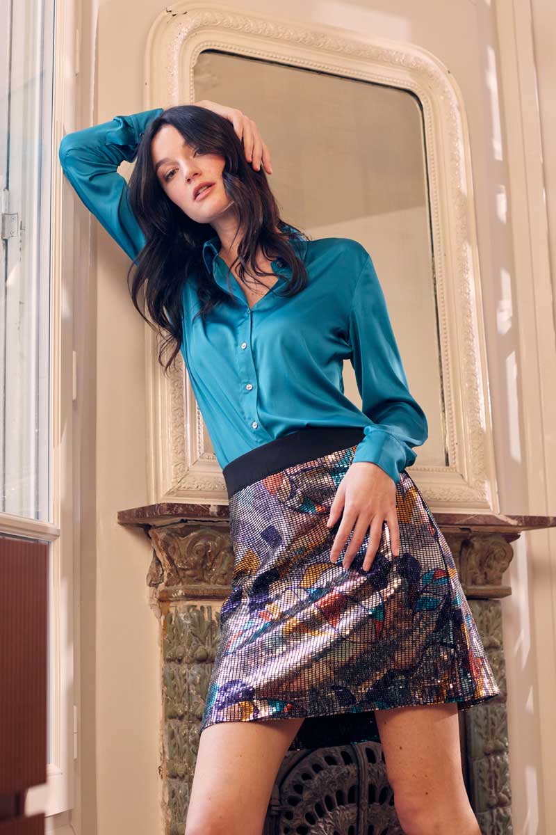 •Jupe originale coupée dans une matière métalisée étonnante aux multiples couleurs éclatantes, ceinture en maille noire, zip dos.