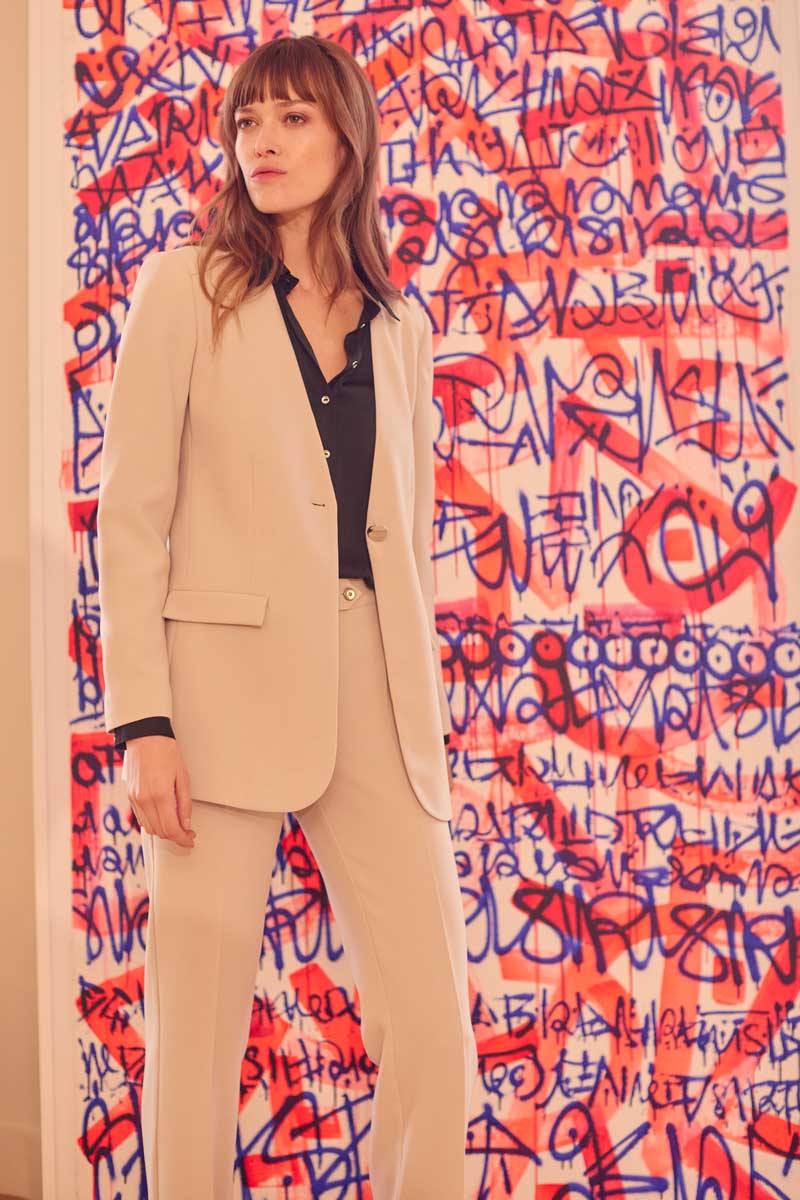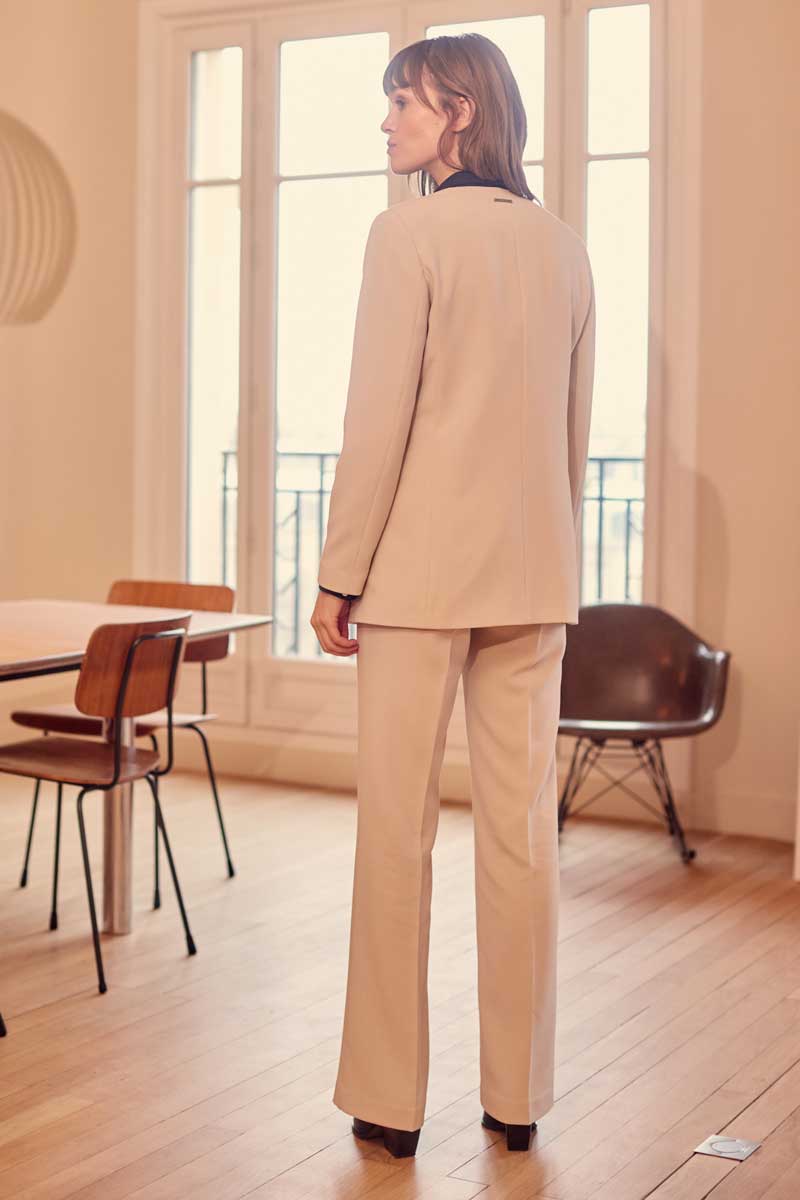 Pantalon poches italiennes à la coupe très pure simplement fermé par un très beau bouton métal, le tombé et l'œil du tissu polyviscose élasthane sont parfaits