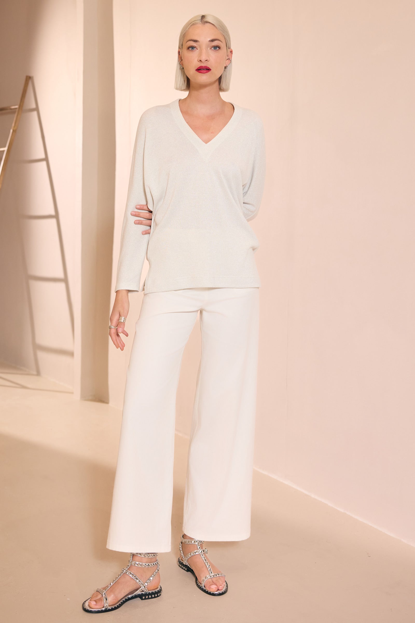 Basic contemporain pour ce pull à la coupe pure,maille lumineuse incrustée de fil lurex argent
