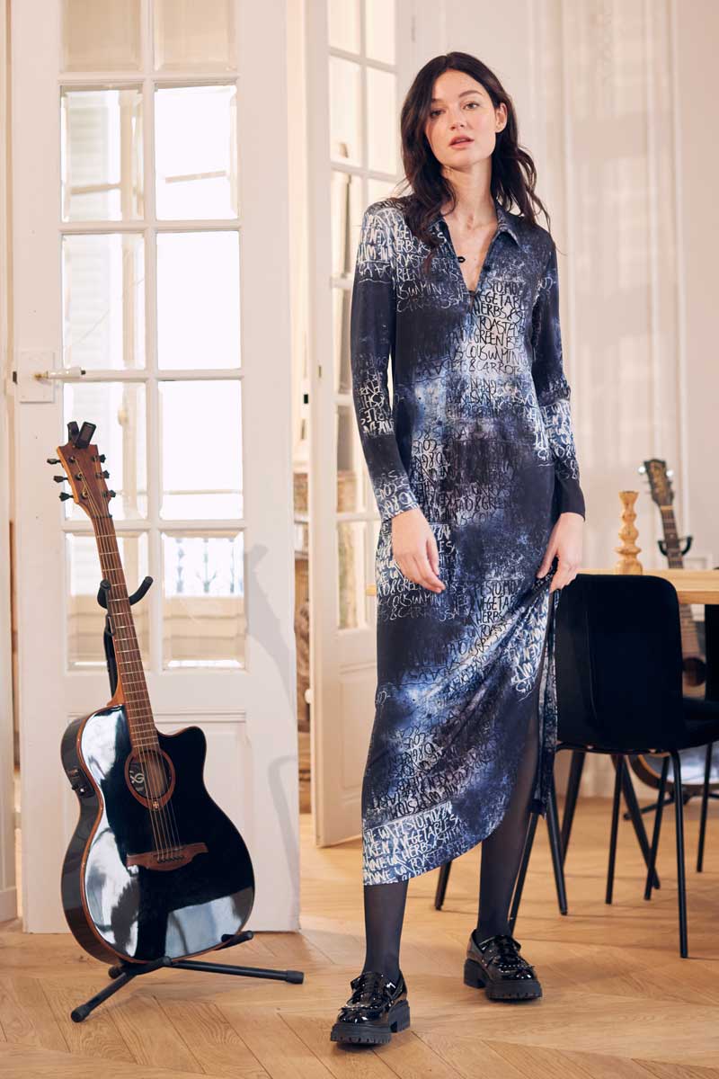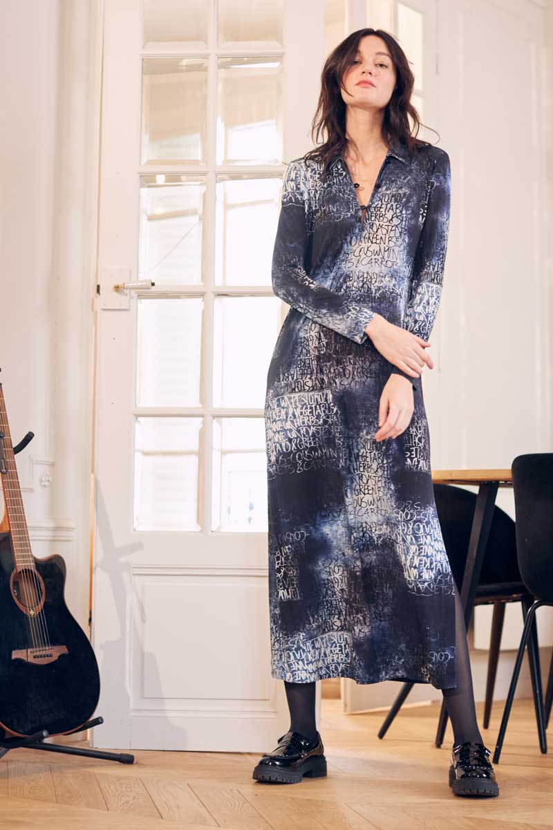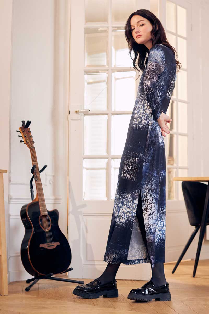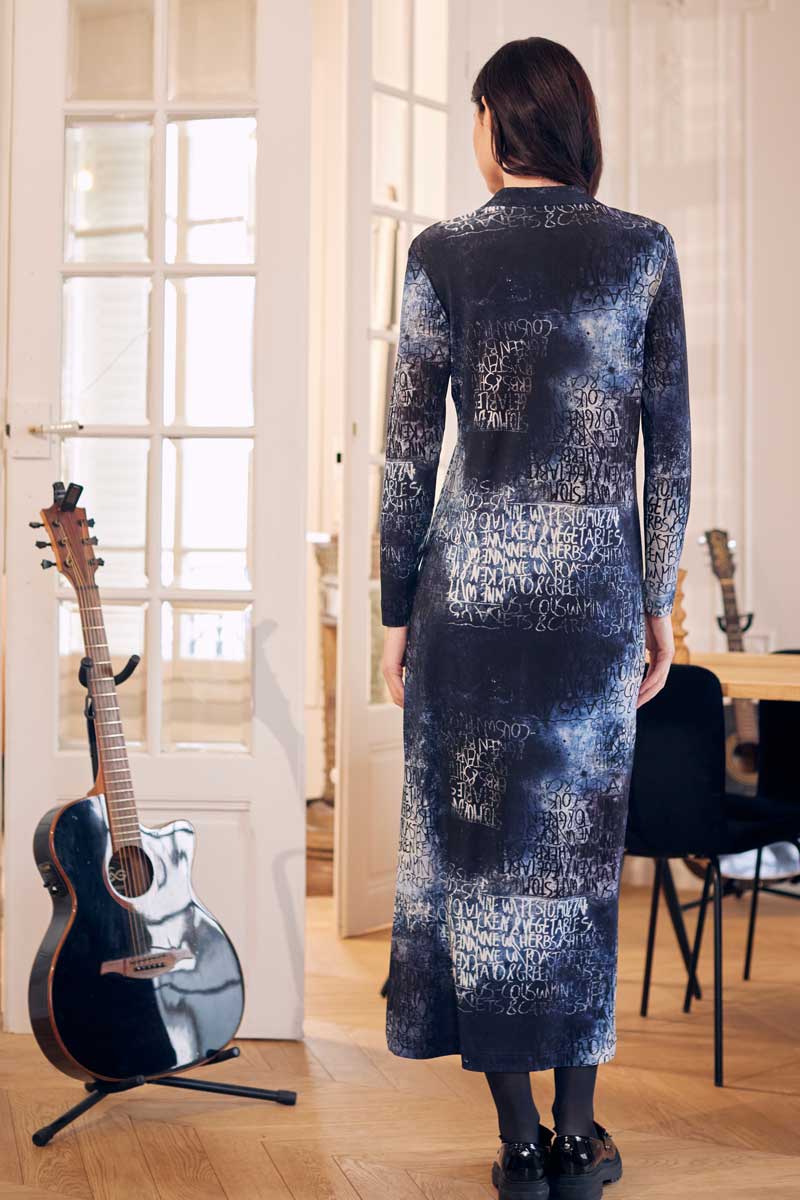 •Robe longue à col et manches longues réalisée dans une maille très douce extensible avec un magnifique imprimé écru bleu et noir, graffiti au lettrage effacé