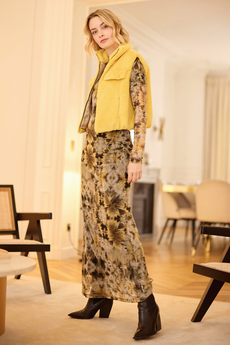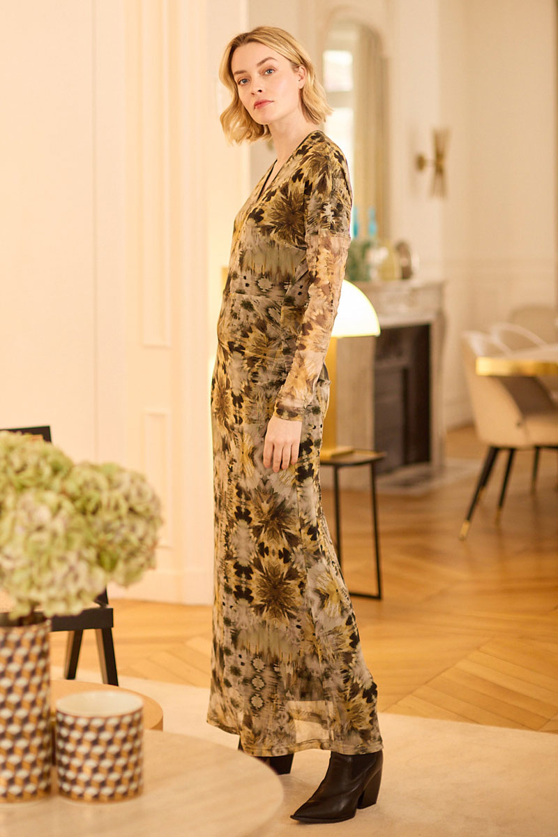 •Robe longue encolure V, realisée dans une résille ultra douce, imprimé graphique moderne