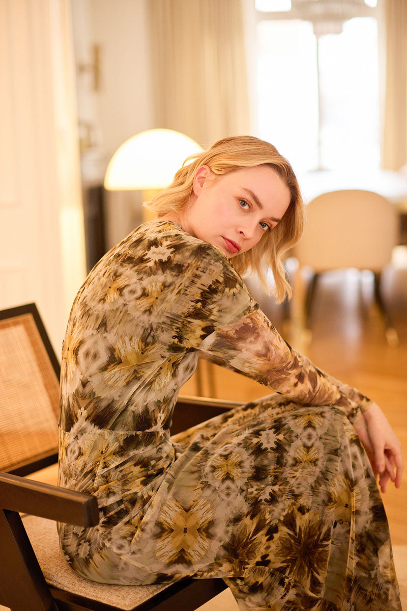 •Long V-neck dress, made from ultra-soft mesh, modern graphic print
