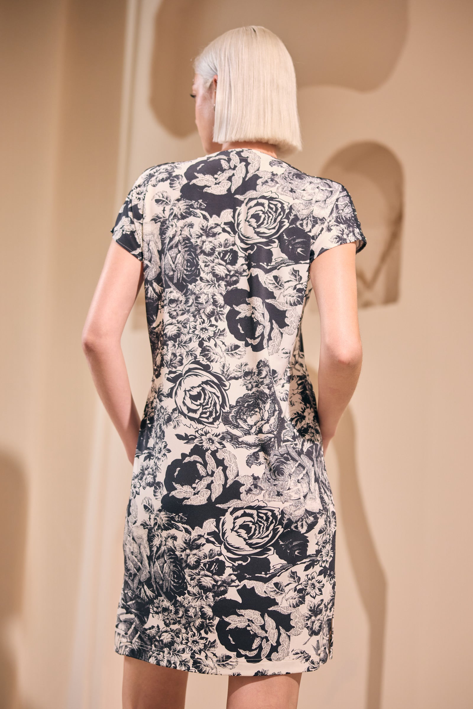 Maille viscose imprimée de roses noires et blanches pour cette robe sans manches réhaussée d'un ruban strass sur l'épaule