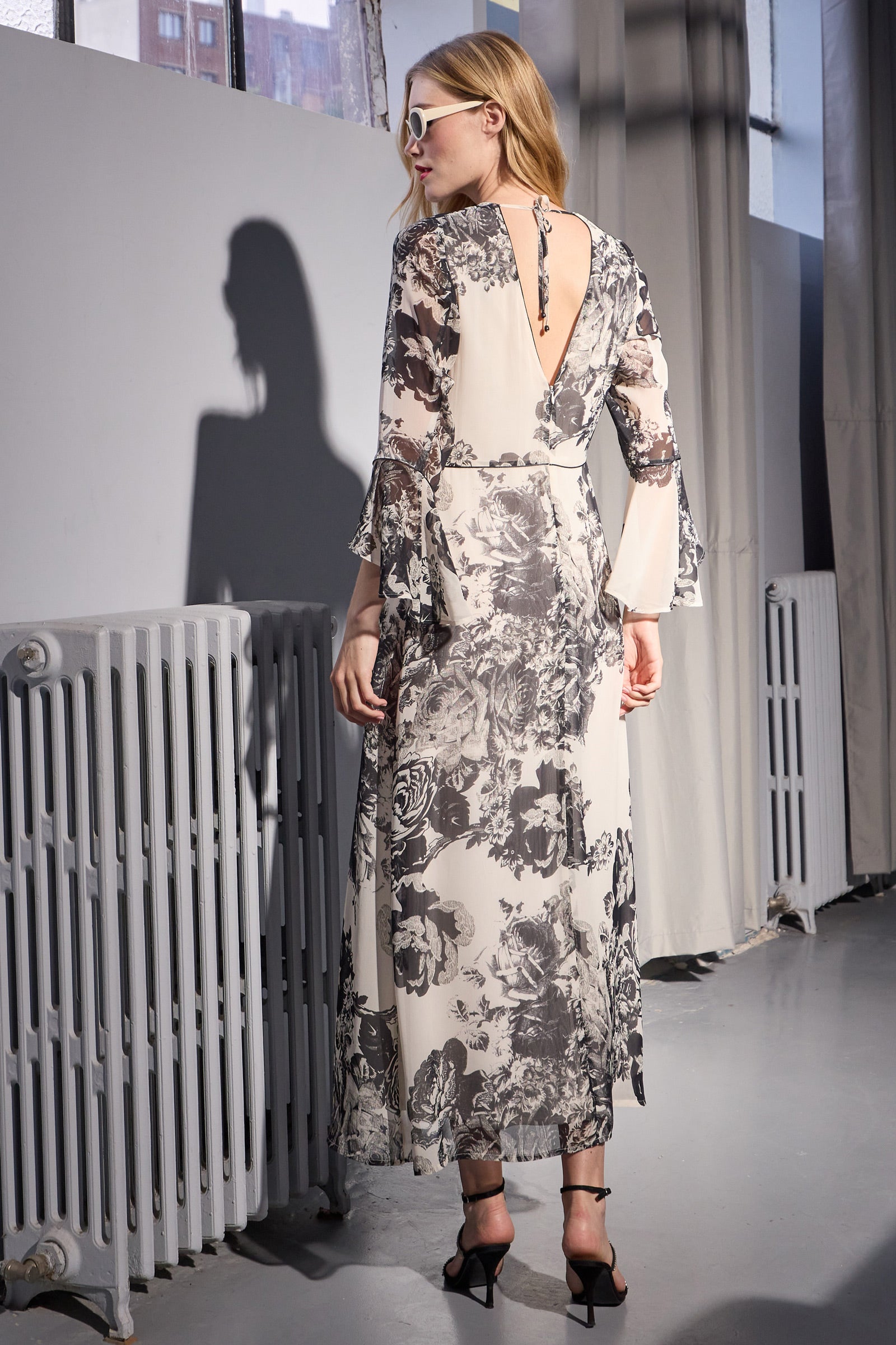 Bouquet de roses en noir et blanc pour l'été, robe longue encolure V en voile viscose avec des manches volantées