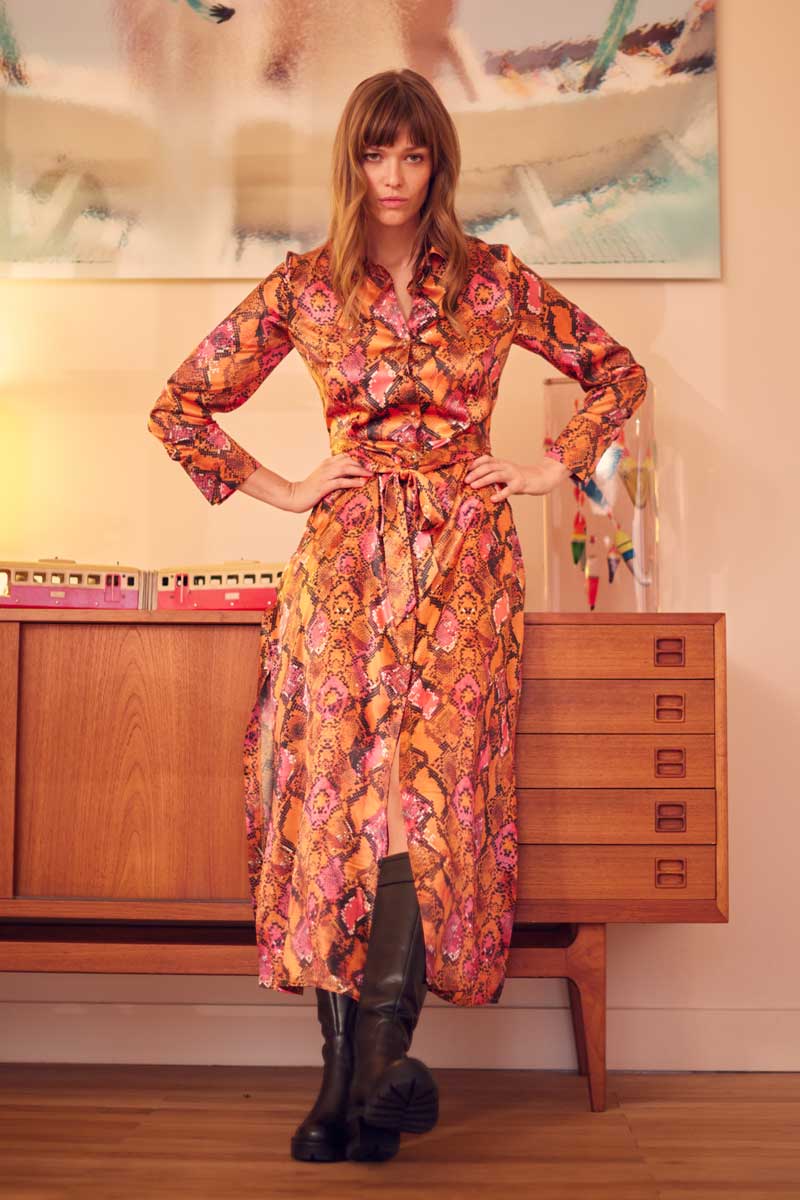 •Robe chemise longue, ceinturée à la taille, coupée dans un magnifique tissu satiné imprimé façon python aux couleurs chatoyantes