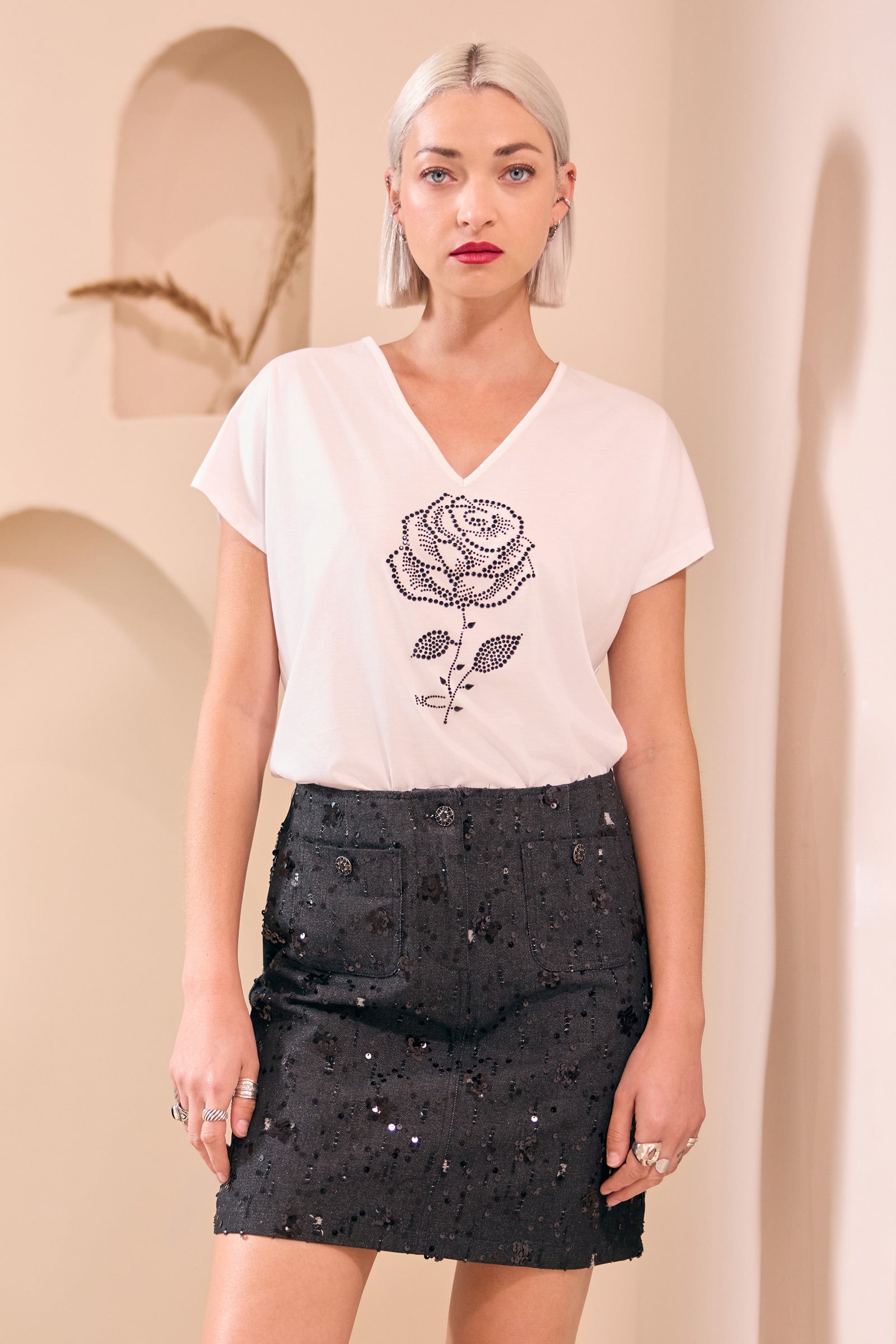 Très belle qualité naturelle en maille viscose coton pour ce tee shirt avec transfert clous, rose noire stylisée