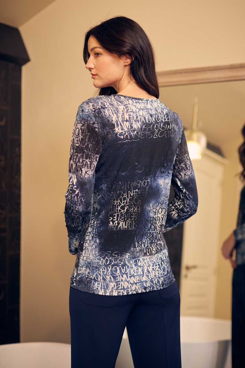 •Tee shirt manches longues réalisé dans une maille très douce extensible avec un magnifique imprimé écru bleu et noir, graffiti au lettrage effacé