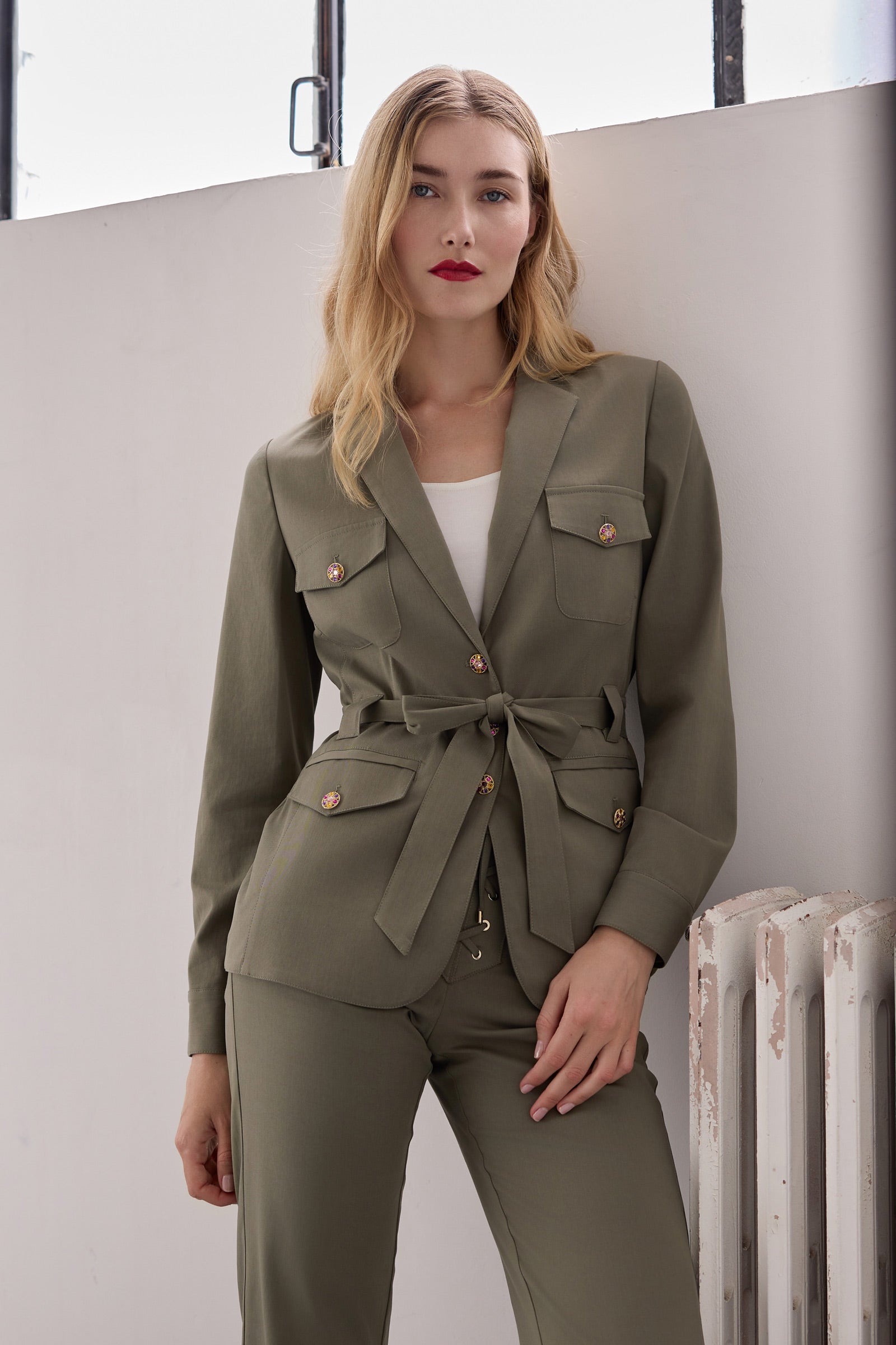 Veste saharienne en coton viscose lycra, poches plaquées réhaussées de très beaux boutons bijoux, ceinture à la taille