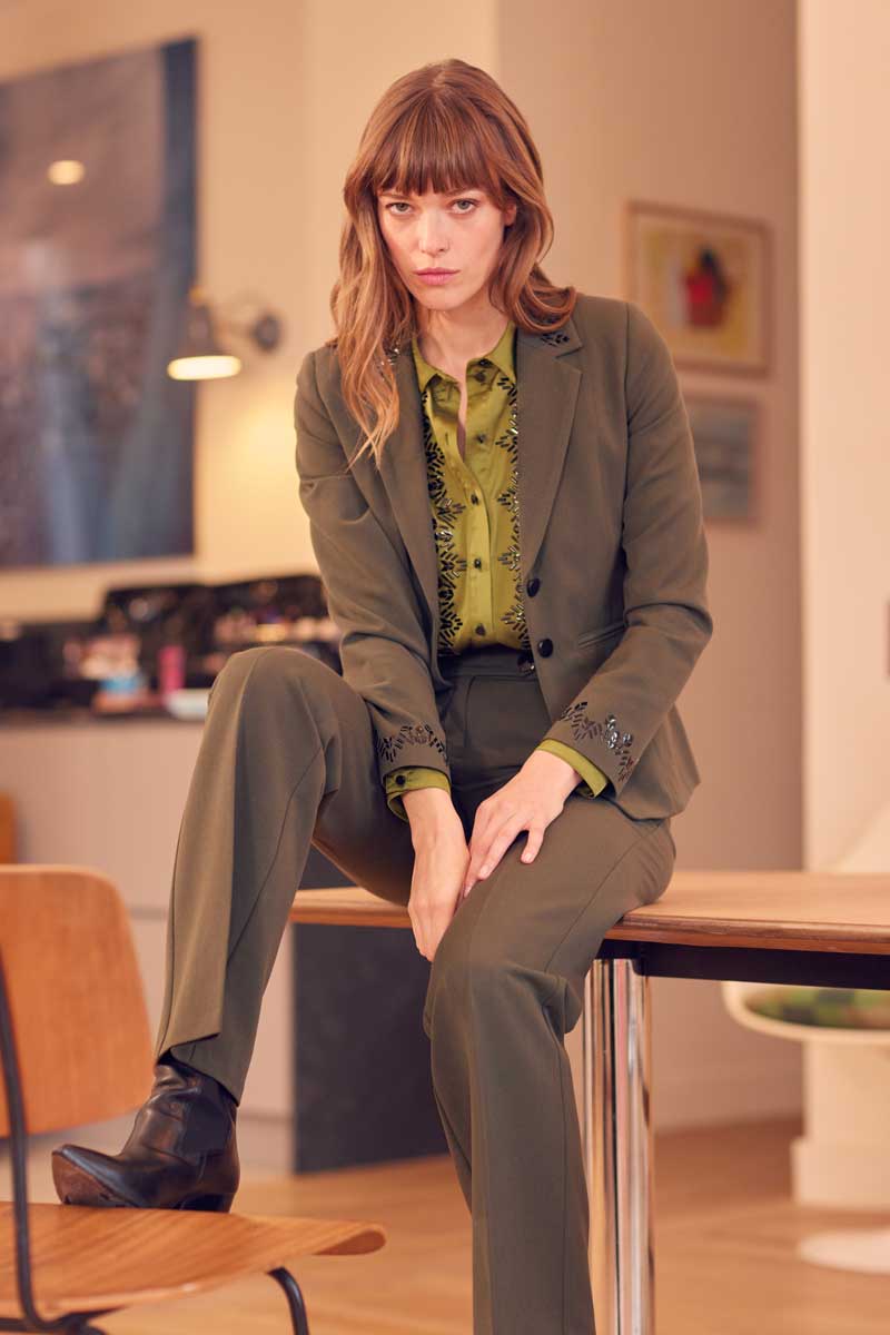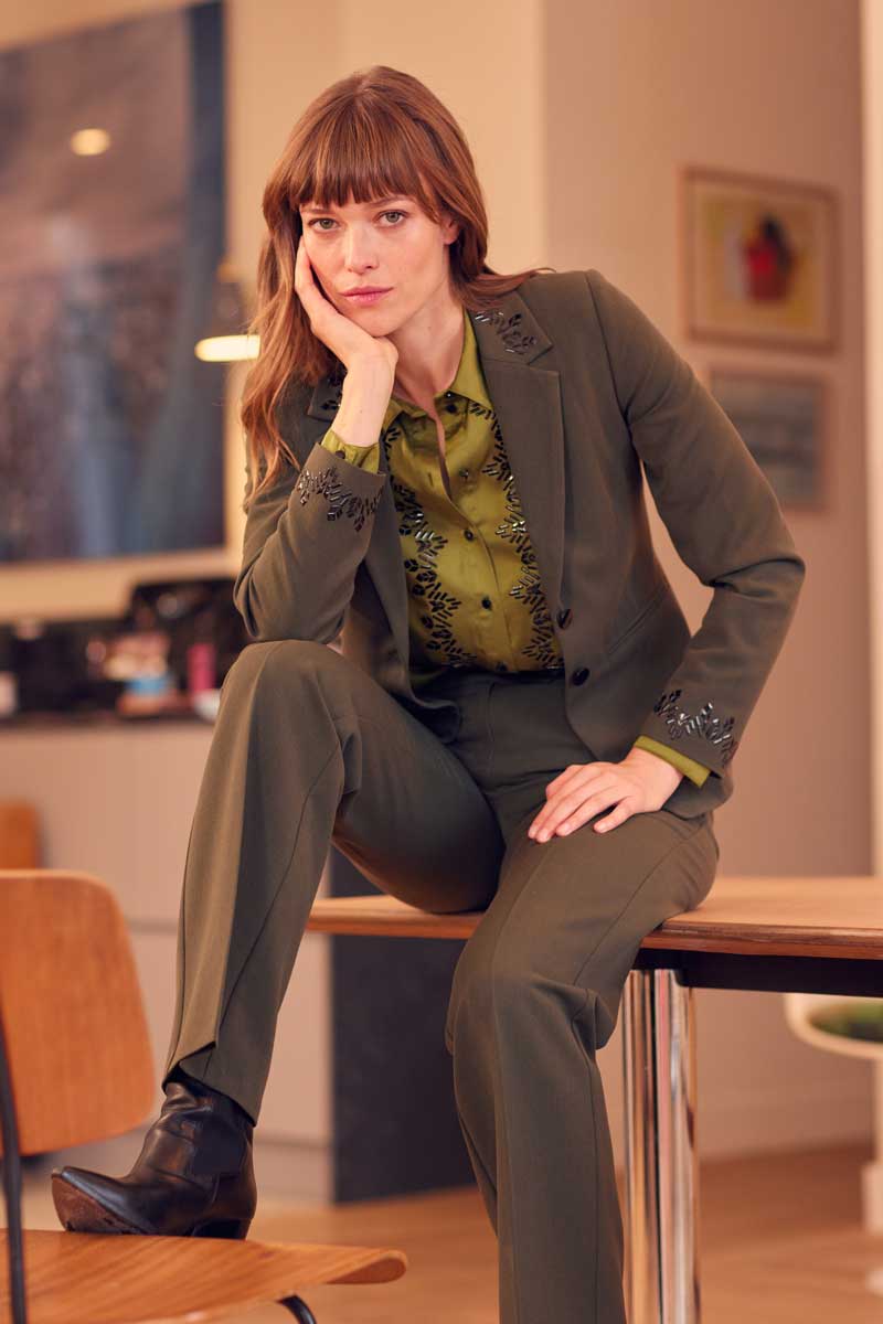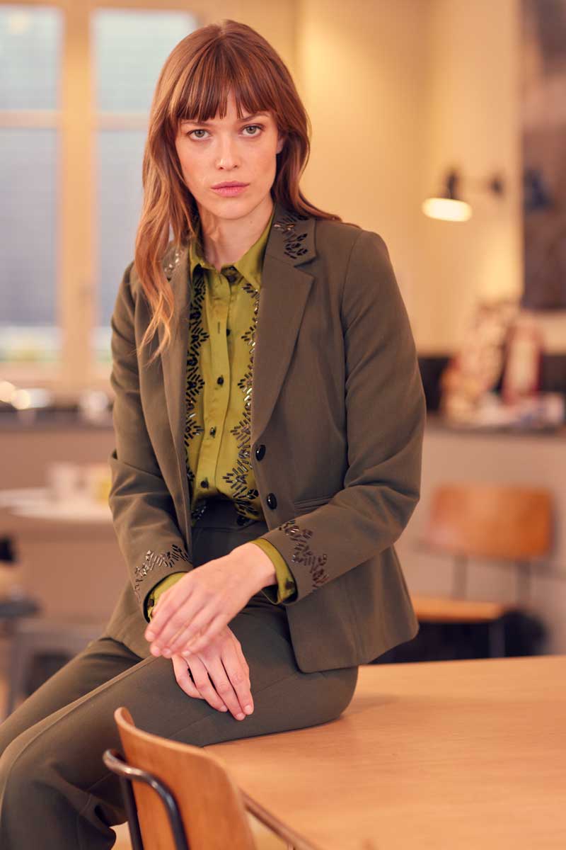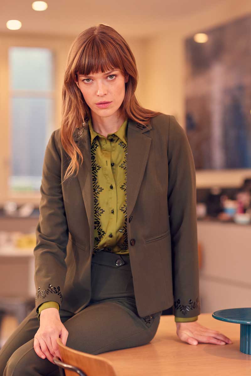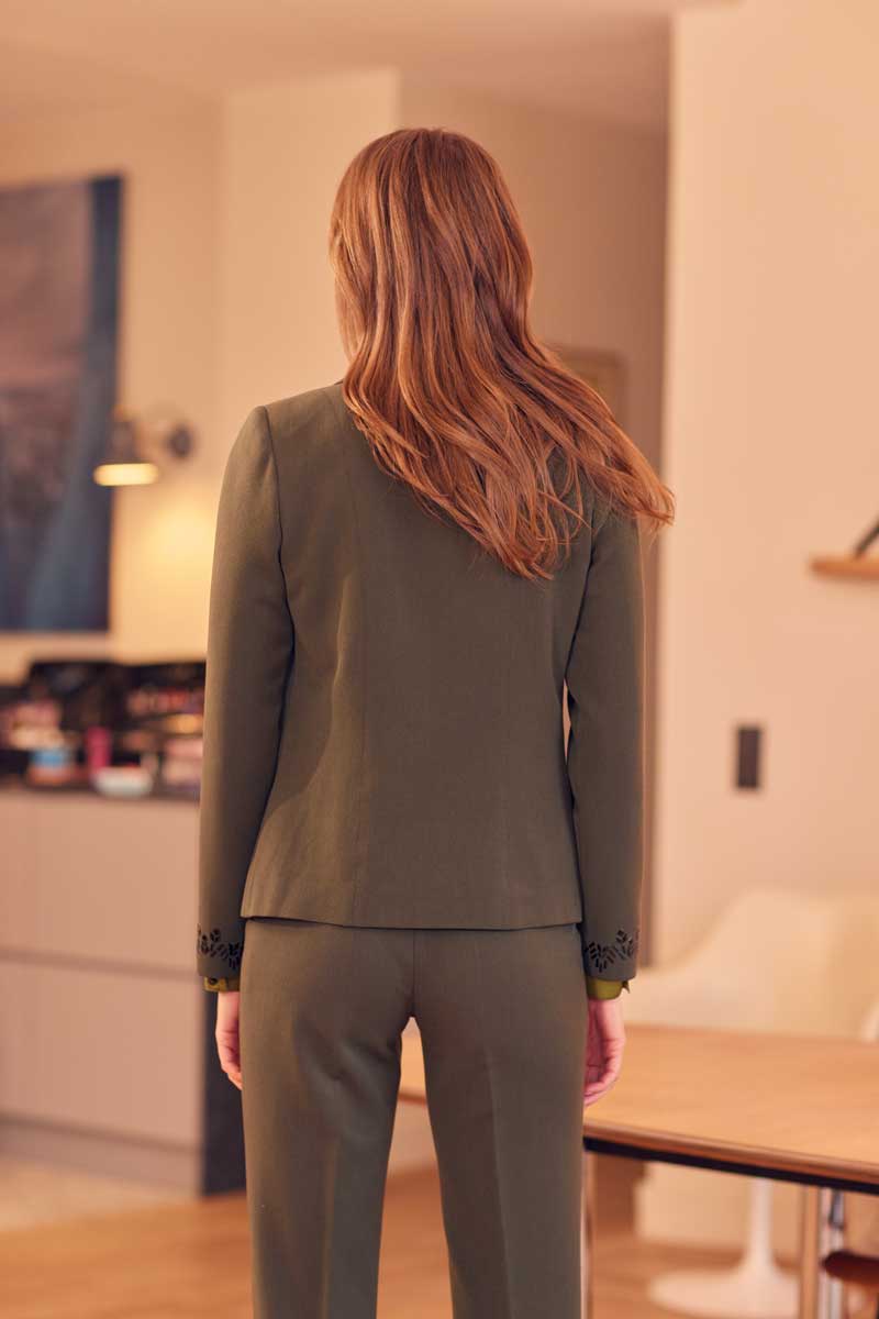 •Veste tailleur 3 boutons avec application de transferts graphiques sur le haut du col et sur les bas de manches